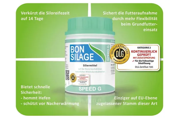bonsialge SPEED G vidljivo skraćuje vrijeme zrenja silaže trava. Sredstvo za siliranje silaže trava, djetelina, lucerne i zelene raži omogućuje otvaranje silosa nakon samo 2 tjedna silažnog vrenja - bez aerobnih procesa kvarenja i naknadnog zagrijavanja. DLG potvrđuje učinkovitost u poboljšanju aerobne stabilnosti i ranog otvaranja silosa.